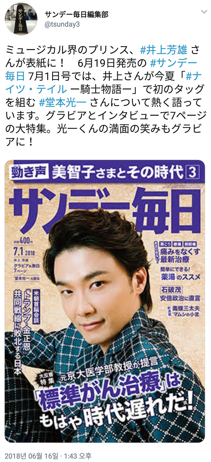 ミュージカル界のプリンス、#井上芳雄 さんが表紙に! 6月19日発売の #サンデー毎日 7月1日号では、井上さんが今夏「#ナイツ・テイル ー騎士物語ー」で初のタッグを組む #堂本光一 さんについて熱く語っています。グラビアとインタビューで7ページの大特集。光一くんの満面の笑みもグラビアに! https://t.co/cMDxRtGTB6
