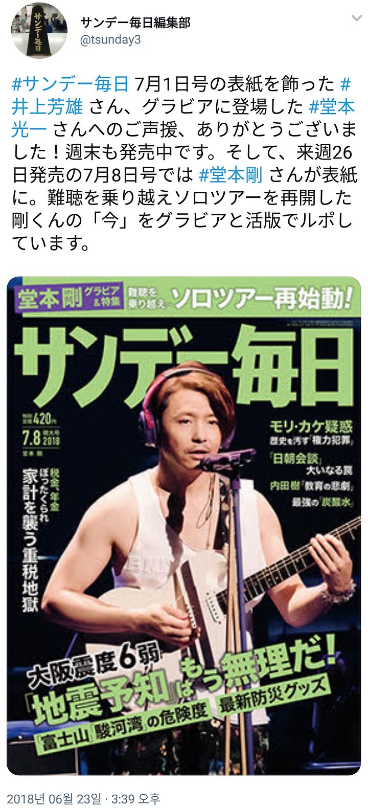 #サンデー毎日 7月1日号の表紙を飾った #井上芳雄 さん、グラビアに登場した #堂本光一 さんへのご声援、ありがとうございました!週末も発売中です。そして、来週26日発売の7月8日号では #堂本剛 さんが表紙に。難聴を乗り越えソロツアーを再開した剛くんの「今」をグラビアと活版でルポしています。 https://t.co/nt1xJ3ECK9