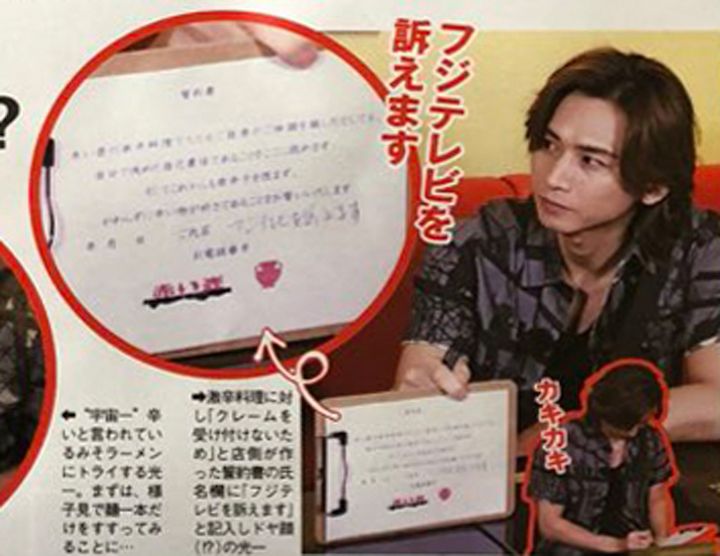 격하게 매운 요리에 대해 "클레임을 받지 않기 위해서" 라며 점포가 만든 계약서의 성명 옆에 "후지테레비를 고소합니다" 라고 기입하고 득의양양한 얼굴(?)의 코이치