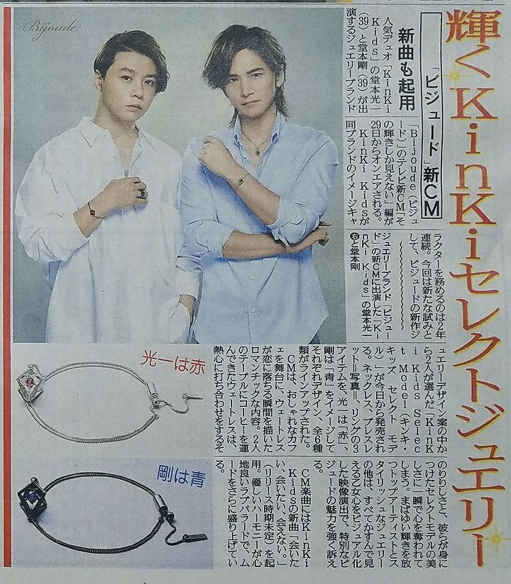 킨키키즈가 동 브랜드의 이미지 캐릭터를 맡는 것은 2년 연속. 이번은 새로운 시도로 비쥬드 신작 쥬얼리 디자인 안 중에서 두 사람이 선택한 "KinKi Kids Select Model"이 오늘부터 발매된다. 목걸이, 팔지, 반지의 3 아이템을 코이치는 "빨강" 쯔요시는 "파랑"을 이미지하여 각각 디자인 전 6종류가 라인업되었다.