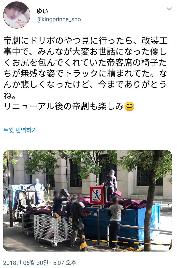 帝劇にドリボのやつ見に行ったら、改装工事中で、みんなが大変お世話になった優しくお尻を包んでくれていた帝客席の椅子たちが無残な姿でトラックに積まれてた。なんか悲しくなったけど、今までありがとうね。
