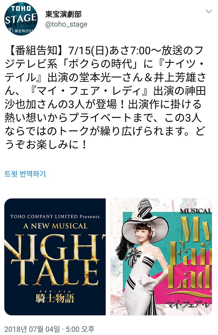 【番組告知】7/15(日)あさ7:00~放送のフジテレビ系「ボクらの時代」に『ナイツ・テイル』出演の堂本光一さん&井上芳雄さん、『マイ・フェア・レディ』出演の神田沙也加さんの3人が登場!出演作に掛ける熱い想いからプライベートまで、この3人ならではのトークが繰り広げられます。どうぞお楽しみに! https://t.co/KMxVfm0zJ3