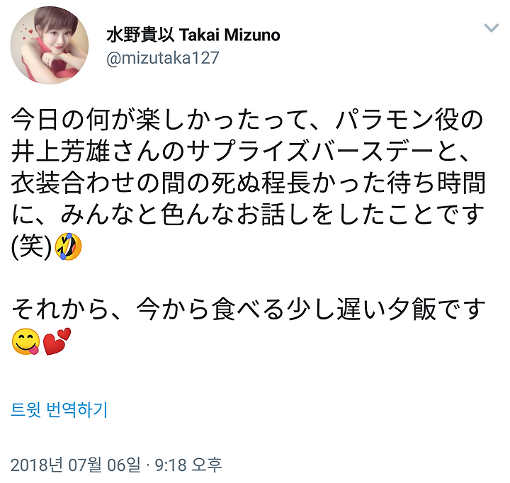 오늘 뭐가 즐거웠냐고 한다면 파라몬 역 이노우에 요시오씨의 깜짝 생일과 의상 맞추기 사이의 죽을 정도로 긴 대기 시간에, 모두 여러가지 이야기 한 것입니다.(웃음)🤣