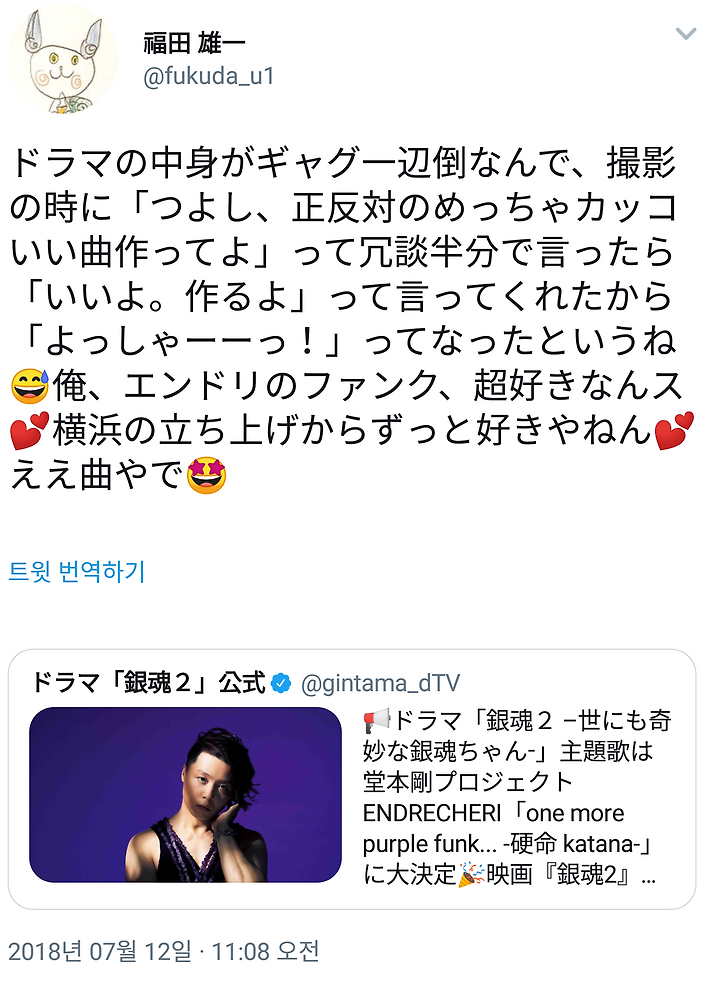 드라마 내용이 개그 일변도라 촬영 때 "쯔요시, 정반대의 굉장히 멋진 곡 만들어줘" 라고 농담으로 말했더니 " 좋아. 만들게"라고 해주었기 때문 "앗싸~!"라고 됐다고 하는 😅 나, 엔드리의 FUNK 짱 좋아합니다 💕 요코하마 (탱크) 설립 때 부터 계속 좋아한다구 💕 좋은 곡이야 🤩 https://t.co/h7hGMei1iW