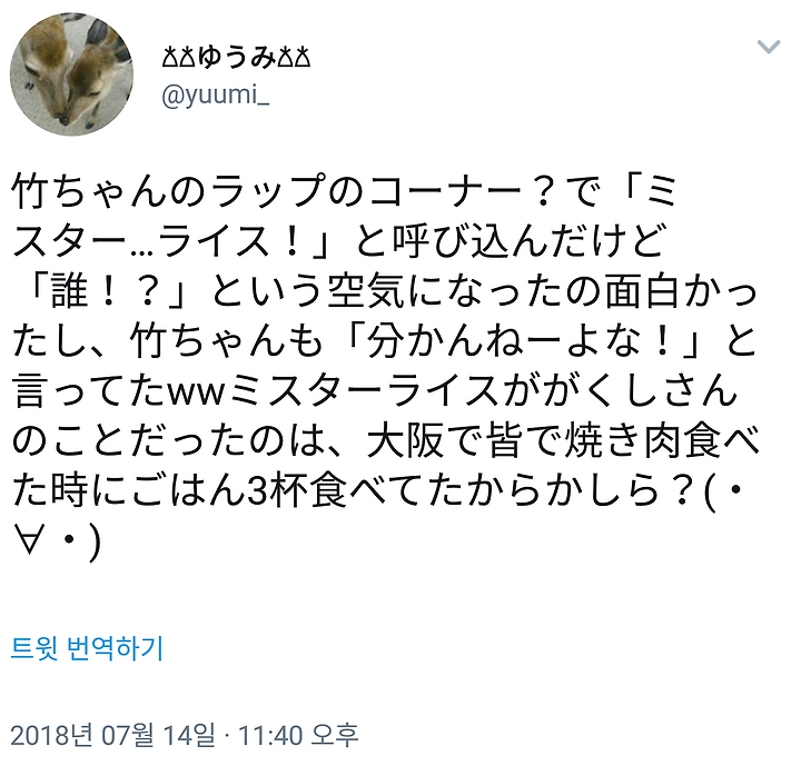 케리 오사카공연이 중지 된날 밤, DUTTCH상이 야키니쿠상을 수배해주어서 그 때 가쿠시상이 아이스가 올라간 와플이나 바닐라 아이스 등 엄청나게 먹었었다! 라는 이야기로부터 "스쟈타 맛있지~" 라는쯔요시군