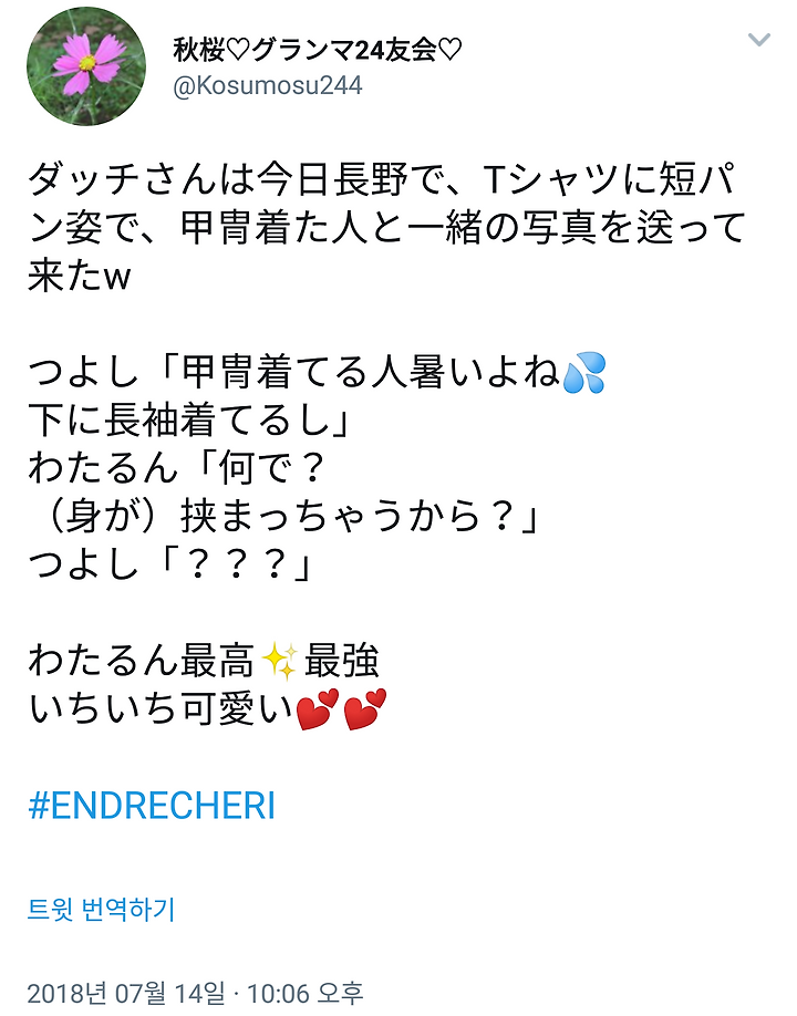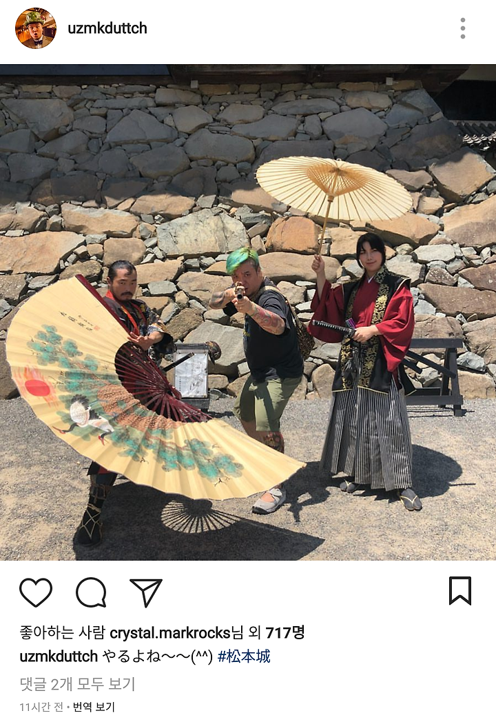 DUTTCH상은 오늘 나가노로, 티셔츠에 반바지 차림으로 갑옷입은 사람과 함께 찍은 사진을 보내왔다.