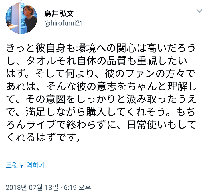 분명 그 자신도 환경에 관심이 높을 것이고, 수건 그 자체의 품질도 중시하고 싶을 것. 그리고 무엇보다 그의 팬들이라면 그런 그의 의지를 제대로 이해하고 의도를 제대로 이해한 상태에서 만족하며 구입해줄 것 같아. 물론 라이브에서 그치지 않고 일상 사용도 해줄 것이 분명합니다.