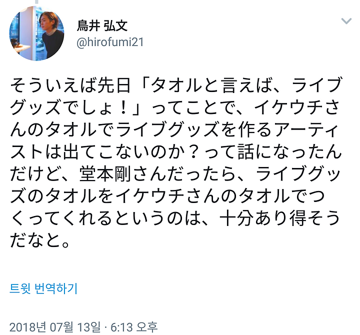 そういえば先日「タオルと言えば、ライブグッズでしょ!」ってことで、イケウチさんのタオルでライブグッズを作るアーティストは出てこないのか?って話になったんだけど、堂本剛さんだったら、ライブグッズのタオルをイケウチさんのタオルでつくってくれるというのは、十分あり得そうだなと。