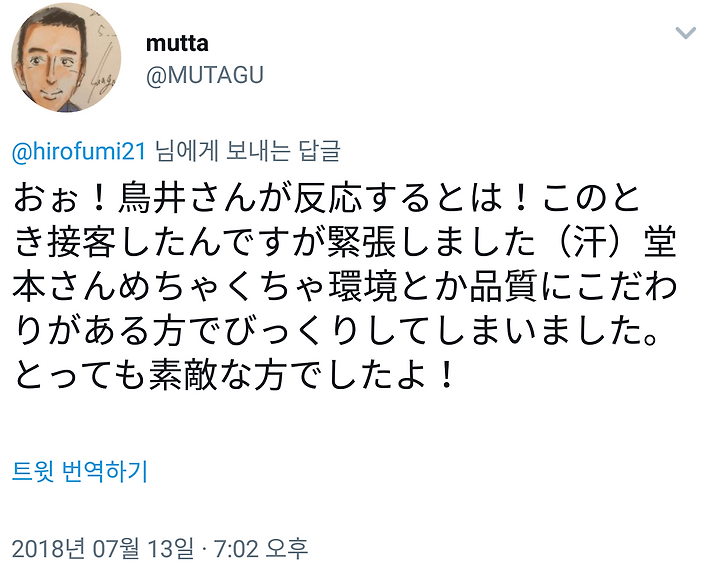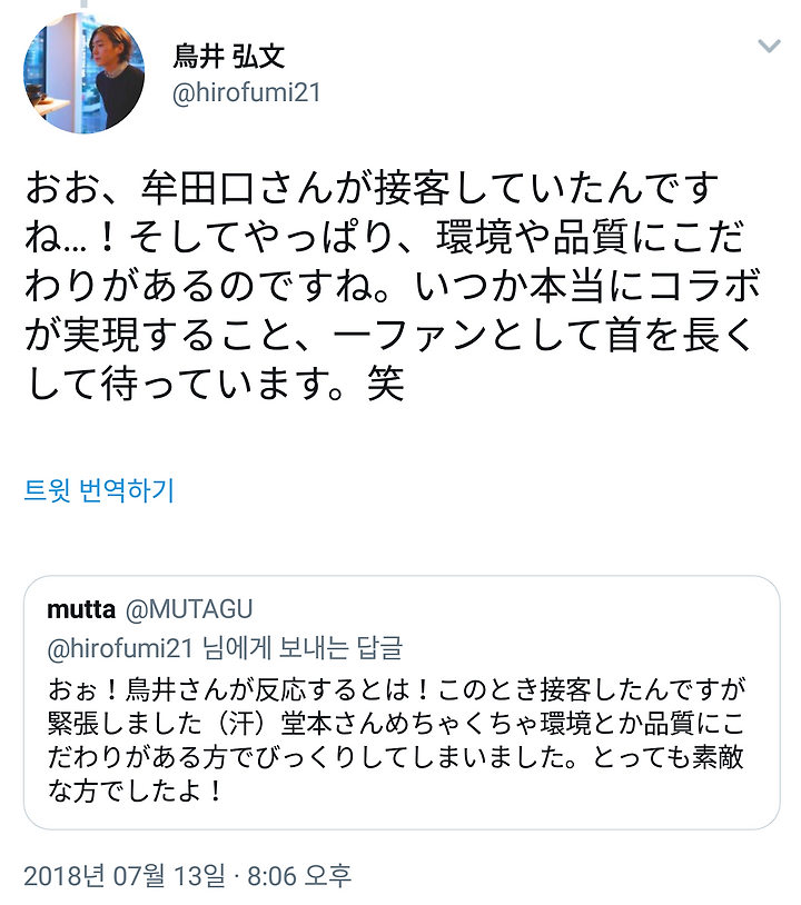 오오, 무타구치씨가 접객하셨군요.....! 그리고 역시 환경이나 품질에 고집이 있는 것이군요. 언젠가 정말 콜라보가 실현되는 것, 한 명의 팬으로서 기다리고 있습니다 ㅎㅎ