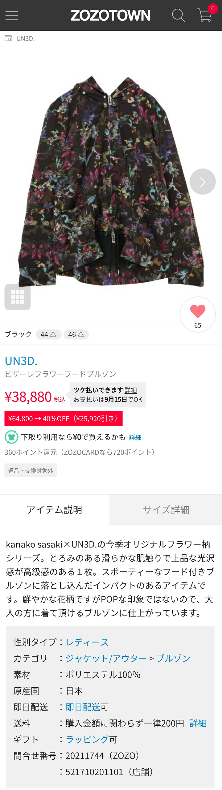 kanakosasaki×UN 3D. 시즌 오리지널 플라워 무늬 시리즈. 걸쭉하고 부드러운 촉감으로 고상한 광택감이 고급스러운 1장. 스포티한 후드 달린 블루종으로 강력한 임팩트있는 아이템이랍니다.밝은 꽃무늬지만 POP인 인상은 아니므로 어른이 입을 수 있는 블루종으로 완성되고 있습니다.