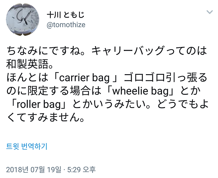사실은 「carrier bag 」데굴데굴 끄는 것에 한정할 경우는 「wheelie bag」이나 「roller bag」이라고 하는 것 같아. 어찌되도 상관 없어 죄송합다.