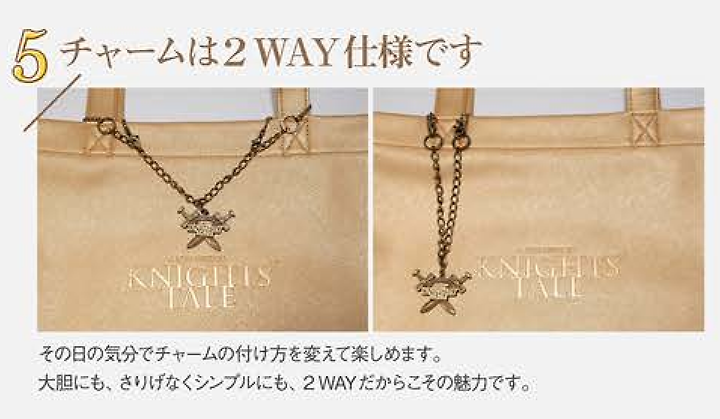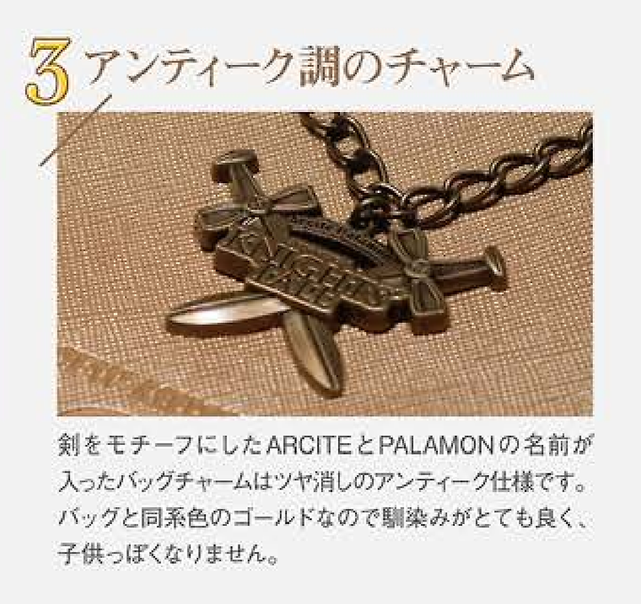 검을 모티프로한 ARCITE와 PALAMON의 이름이 들어간 백 장신구는 광택없는 앤틱 사양입니다.