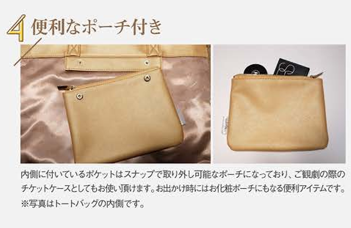 내측에 달려 있는 포켓은 스냅으로 분리할 수 있는 파우치가 되어 있어 관극 때 티켓 케이스로서도 사용하실 수 있습니다.