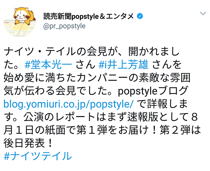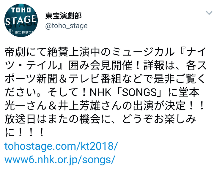또한 이번 가을 NHK에서 방송되는 "SONGS"에 도모토와 이노우에가 출연하기로 결정. 방송에서는 "나이츠 테일" 넘버가 스페셜 버전으로 공개되고 리허설 모습이나 첫날 무대 영상, 두 사람의 대담이 방송된다. 자세한 것은 속보를 기다리다.