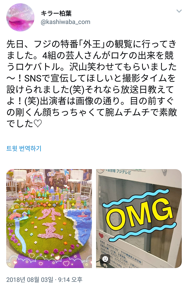 先日、フジの特番「外王」の観覧に行ってきました。4組の芸人さんがロケの出来を競うロケバトル。沢山笑わせてもらいました~!SNSで宣伝してほしいと撮影タイムを設けられました(笑)それなら放送日教えてよ!(笑)出演者は画像の通り。目の前すぐの剛くん顔ちっちゃくて腕ムチムチで素敵でした♡ https://t.co/cxTLdFVbqQ