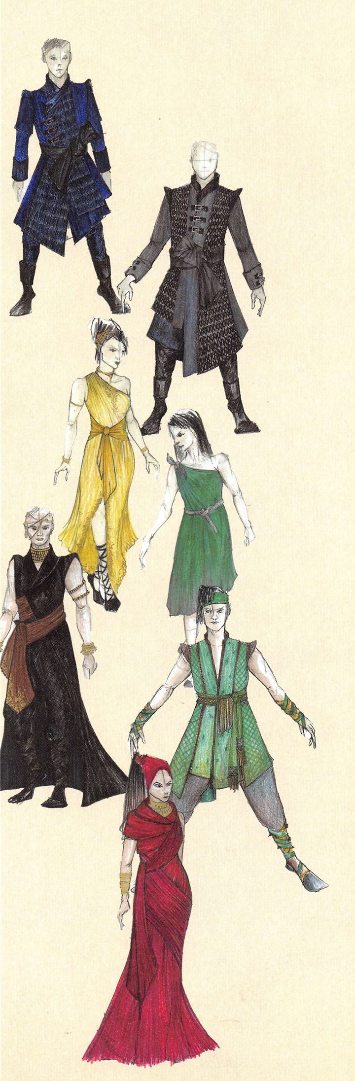 그것과 동시에, 사전에 존 케어드로부터「세상에 온갖 곳에서부터 다른 종족이나 캐릭터가 모인 듯한 세계」라는 설명을 받고 있었기 때문에 트라이벌(종족적)인 것을 의식해 어느 그룹에 속한 어떤 캐릭터의 사람인지 의상으로부터 알 수 있도록 신경썼습니다. 예를 들어 시시어스는 아테네의 대공이기 때문에 금이나 브론즈, 중후한 실크나 브로케이드(무늬 직물) 등을 사용하고, 자수나 쥬얼리와 같은 장식도 화려하게 달아 리치함을 표현하고 있습니다. 허리띠의 라인에는 스모 선수의 케쇼마와시(化粧回し, 씨름선수가 의식을 지낼 때 두르는 아름답게 수놓은 짧은 앞치마 모양의 드림) 라인을 차용했습니다.