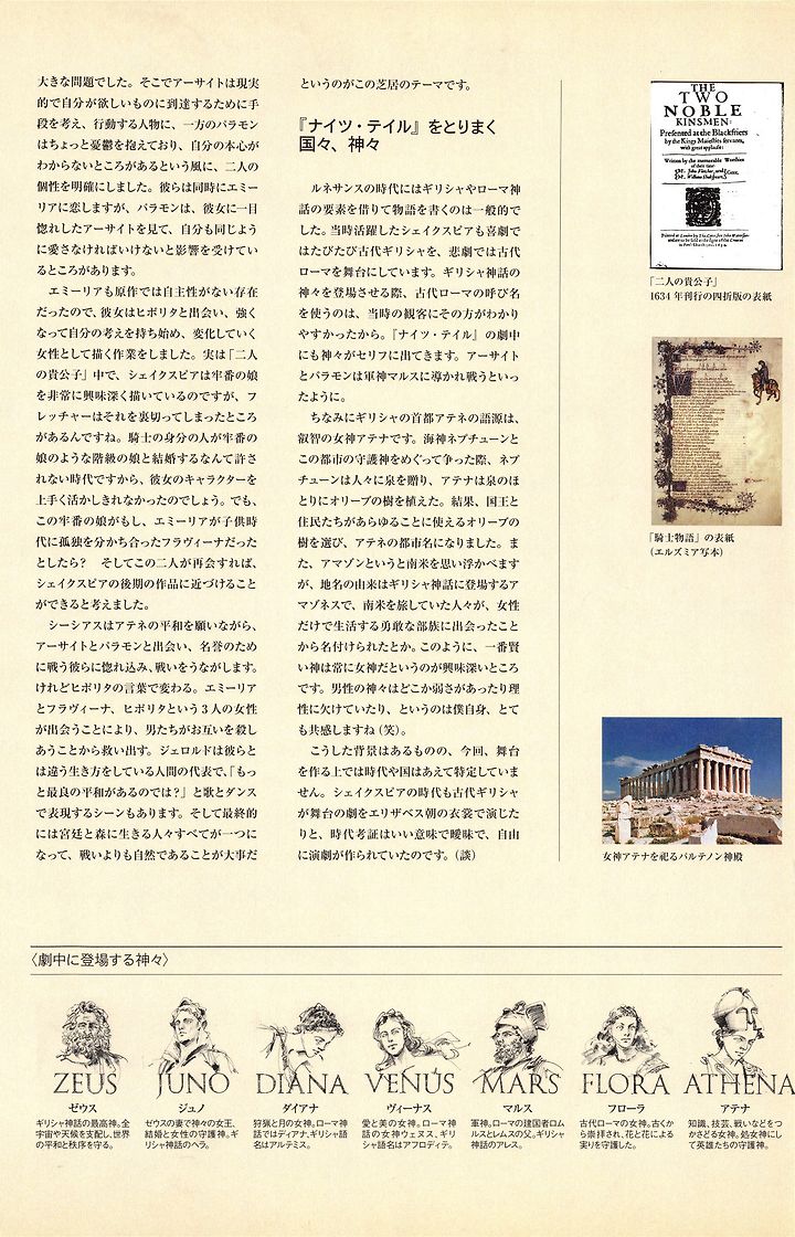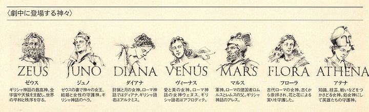 르네상스 시대에는 그리스나 로마신화의 요소를 빌려 이야기를 쓰는 것은 일반적이었습니다. 당시 활약했던 셰익스피어도 희극에서는 때때로 고대 그리스를, 비극에서는 고대 로마를 무대로 하고 있습니다. 그리스 신화의 신들을 등장 시킬 때 고대 로마의 호칭을 사용하는 것은, 당시 관객은 그러는 편이 이해하기 쉬웠기 때문. 『나이츠 테일』의 극중에도 신들이 대사에 나옵니다. 아사이트와 파라몬이 군신인 마스에게 인도되어 싸운다, 라고 하는 것 처럼.