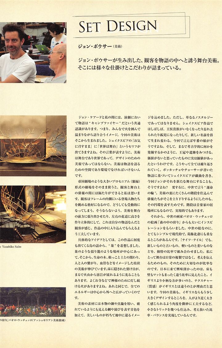 미술의 소재엔에는 진짜 동이나 놋쇠를 사용해 깨져있는 것럼 보이는 망이나 녹을 나타내는 청색을 더하여 아름다은 것이 썩어서 땅속으로 돌아가는 이미지를 담았습니다. 단순한 노스탤지여서는 안됩니다. 셰익스피어 작품에서는 자주 왕귀족이 사라지거나, 잊혀지거나, 고아가 되거나 하고 새로운 이름을 얻어 다시 태어나는. 이번으로 말하자면 옥지기의 딸이 그렇네요. 그리고 마치 고고학적으로 뭔가를 발굴하는 것 처럼 왕관이나 유적을 발견하는. 가치가 없다고 생각하고 있던 것이 사실은 가치가 있었다고 하는 것입니다. 이렇게 모든 것은 반복되어 가는. 봇카쵸나 초서가 섰던 이야기를 기반으로 셰익스피어가 희곡을 쓰고, 이번 존이 그것을 새로운 무대로 하는 것도 그렇지요? 요컨대 세상에서 말하는 "운명의 고리". 미술의 뒷면에 많은 계단이 장치되어 배우들이 거기를 오르락내리락 하도록 한 것도 그 원환을 나타내기 위해서 입니다. 계단은 음악가가 있는 장소로도 되기 떄문에 실용적이기도 합니다.