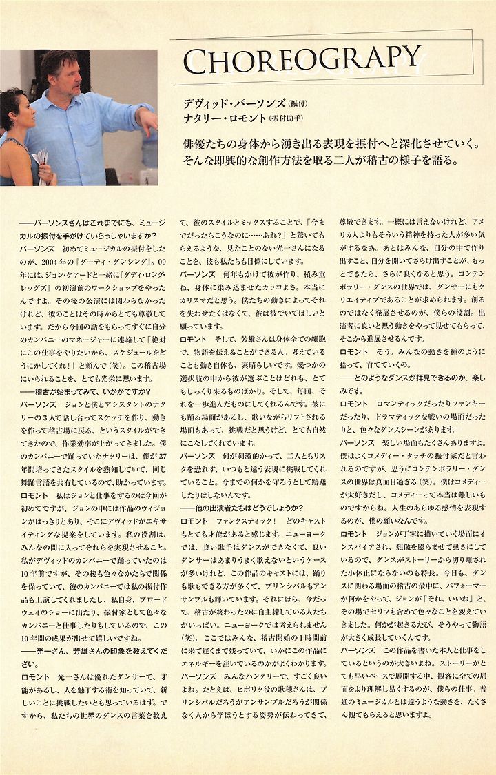 ■ 로먼트: 저는 존과 일을 하는 것은 이번이 처음입니다만 존의 안에는 작품의 비전이 확실해서 거기에 데이비드가 흥미로운 제안을 하고 있습니다. 저의 역할은 모두의 사이에 들어가 그것들을 실현시키는 것. 제가 데이비드의 컴퍼니에서 춤추고 있던 것은 10년 전입니다만, 그 후도 여러 중개로 관계를 유지하고 있어 그의 컴퍼니에서는 제 안무 작품도 상연해주었고, 저 자신 브로드웨이의 쇼에 나가거나 안무로서 여러 컴퍼니와 일을 하기도 하고 있기 때문에 이 10년 간의 성과가 나와서 기쁘네요.