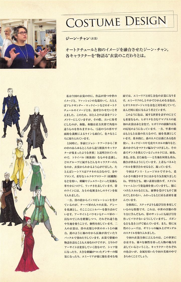 이렇게 색은 속한 세계를 나타내는 것에 매우 중요한 것. 히폴리타를 포함한 아마조네스의 최초의 의상은 빨강과 금색으로 히폴리타의 머리 장식은 말의 꼬와 같이 되어 있습니다. 한 편, 옥지기의 딸은 원래는 숲의 주인이기 때문에 녹색을 기조로 하고 있습니다. 기본적으로 숲의 사람들에게는 숲에 있는 색을 사용해 넥크 피스나 털 가죽이나 해골 장식 등 숲의 조각을 매듭땋기로 달았습니다. 그 숲에서 댄스를 가르치고 있는 제럴드에게는 녹색, 갈색, 금색, 또 녹색.... 으로 천을 몇 장이나 겹쳐 움직임이 나오도록 하고 있습니다. 상의도 패널과 패널을 잇는 등 공들였습니다.
