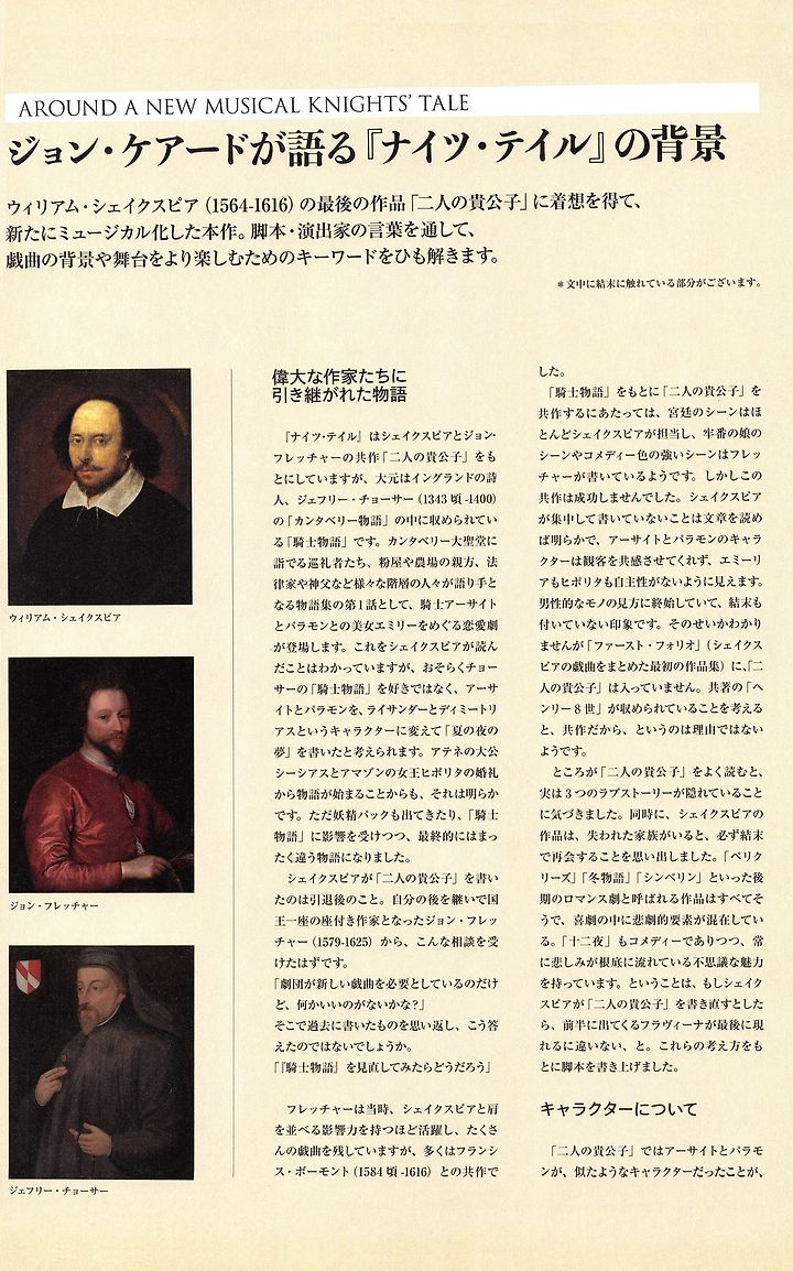 『나이츠 테일』은 셰익스피어와 존 플레처의 공작「두 명의 귀공자」를 기반으로 하고 있습니다만 근본은 영국의 시인, 제프리 초서 (1343 경 -1400)의「캔터베리 이야기」속에 담겨있는「기사 이야기」입니다. 캔터베리 대성당에 참배하는 순례자들, 방앗간이나 농장의 장인, 법률가나 신부 등 다양한 계층의 사람들이 이야기꾼이 되는 이야기집의 제 1화로서 기사 아사이트와 파라몬과의 미인 에밀리아를 둘러싼 연애극이 등장합니다. 이걸 셰익스피어가 읽었다는 것은 알고 있습니다만, 아마 초서의「기사 이야기」를 좋아하지는 않아서 아사이트와 파라몬을 라이샌더와 드미트리어스 라고 하는 캐릭터로 바꾸어「한 여름 밤의 꿈」을 썼다고 생각됩니다. 아테네의 대공 시시어스와 아마존의 여왕 히폴리타의 혼례로부터 이야기가 시작되는 점에서부터도 그것은 분명합니다. 다만 요정 퍽도 나오거나「기사 이야기」에 영향을 받으면서도 최종적으로는 전혀 다른 이야기가 되었습니다.