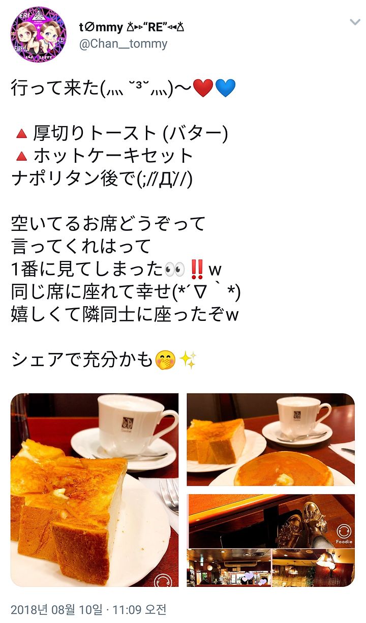 메뉴는 버터 토스터 (객석이 에??? 하니까 내 위장은 우주라고 ㅋㅋㅋ) ☞ 핫케이크 ☞ 스태프가 나폴리탄 먹고 싶다고 해서 쉐어 ☞ 핫케이크 조금만 더 먹고 싶어서 스태프꺼 세모 모양 조각 잘라서 먹음