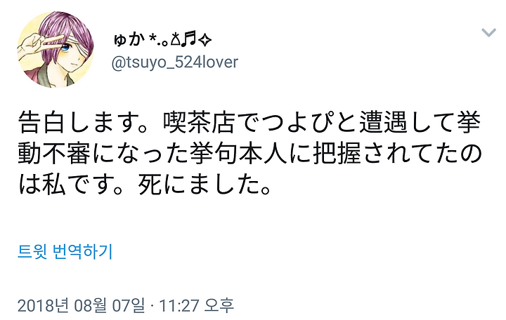고백합니다. 찻집에서 쯔요삐와 조우하고 거동이 수상하게 되어 본인에게 파악된 것은 저입니다. 죽었습니다.