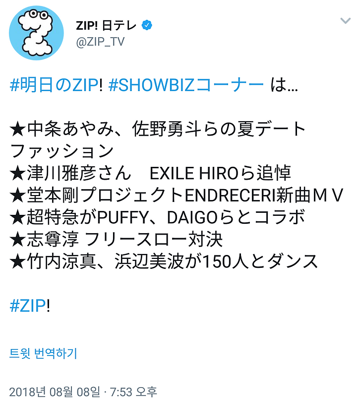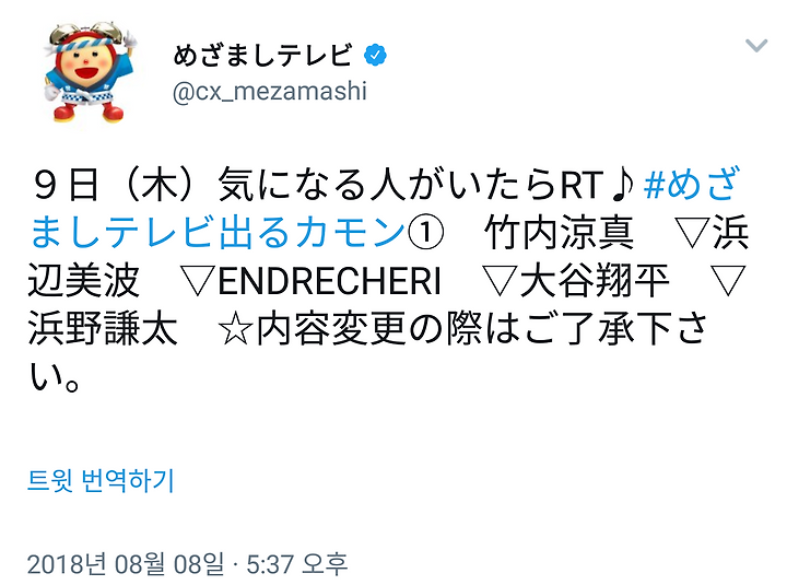 剛 244 [도모토 쯔요시] 8/9 めざましテレビ & ZIP (신곡 MV) 자오딩 2018. 8. 8. 18:07 9日(木)気になる人がいたらRT♪#めざましテレビ出るカモン① 竹内涼真 ▽浜辺美波 ▽ENDRECHERI ▽大谷翔平 ▽浜野謙太 ☆内容変更の際はご了承下さい。