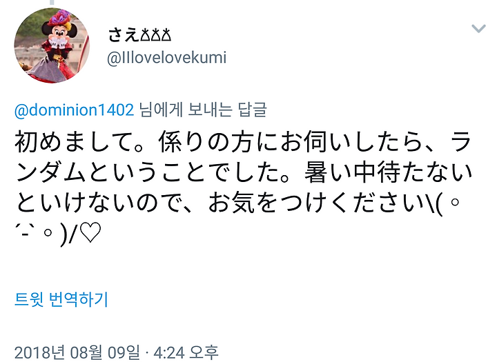 처음 뵙겠습니다. 안내원께 여쭈어 보니 랜덤이라는 것이였습니다. 더운데 기다리지 않으면 안 되니까 조심하세요.(◦'-`◦)/♡