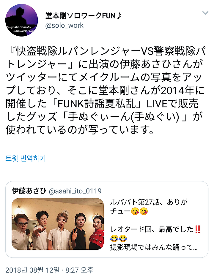 『쾌도 전대 루팡 레인저 VS 경찰 전대 패트 레인저』에 출연의 이토 아사히씨가 트위터에서 메이크룸의 사진을 올렸는데 거기에 도모토 쯔요시씨가 2014년에 개최한 "FUNK시요우카시랑" LIVE에서 판매한 굿즈 "테누구잉(손수건)"이 사용되고 있는 것이 찍혀있습니다.