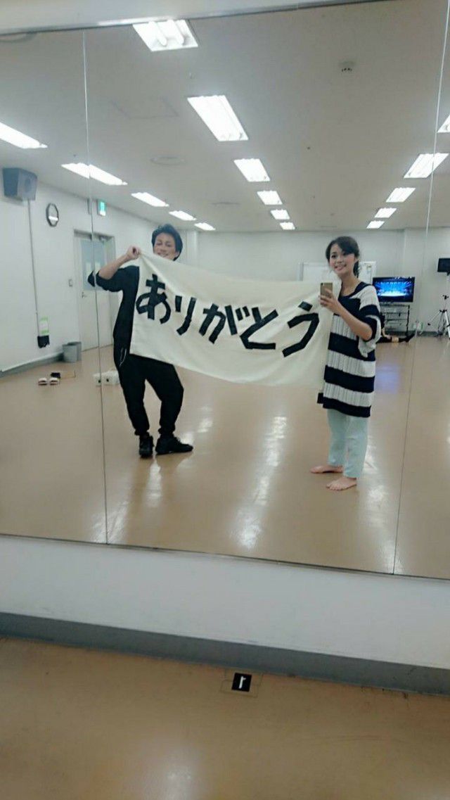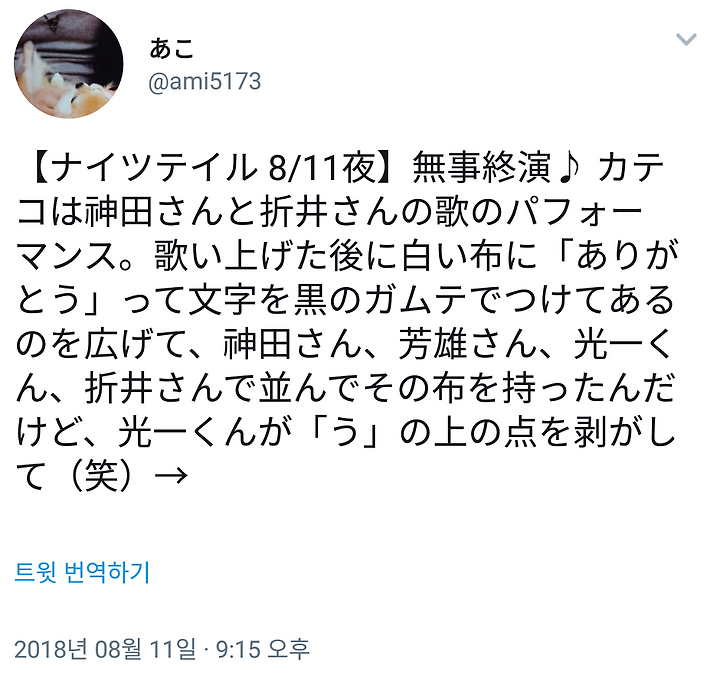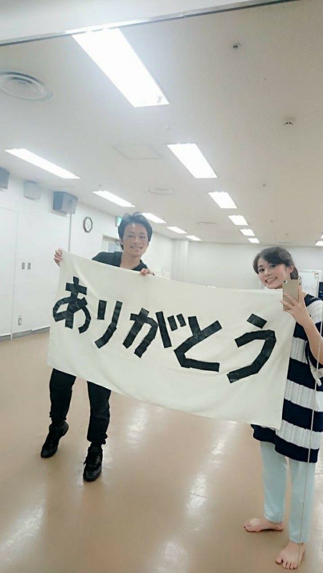 【ナイツテイル 8/11夜】無事終演♪ カテコは神田さんと折井さんの歌のパフォーマンス。歌い上げた後に白い布に「ありがとう」って文字を黒のガムテでつけてあるのを広げて、神田さん、芳雄さん、光一くん、折井さんで並んでその布を持ったんだけど、光一くんが「う」の上の点を剥がして(笑)→