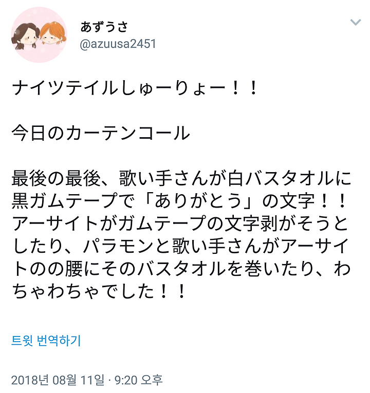 [나이츠 테일 8/11밤] 무사 종연 ♪ 커튼콜에서는 칸다씨와 오리이씨의 노래 퍼포먼스. 노래한 후에 흰 천에 "아리가토우" 라는 글자를 검은 고무테이프로 붙이고 있는 것을 펼쳐서 칸다씨, 요시오씨, 코이치군, 오리이씨로 나란히 그 천을 들었는데, 코이치군이 "우" 위의 점을 뜯어사