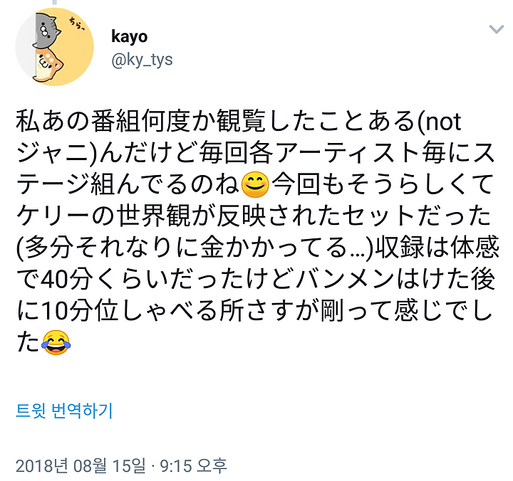 나 저 프로그램 몇번 본 적 있는데(not쟈니) 매회 각 아티스트마다 무대 짜고 있는거네 😊 이번에도 그렇게 해서 케리의 세계관이 반영된 세트였다(아마 나름대로 돈 드는..) 수록은 감각으로 40분 정도였는데 밴드 멤버 퇴장 후 10분 정도 말하는 부분 역시 쯔요시라는 느낌이었어 😂