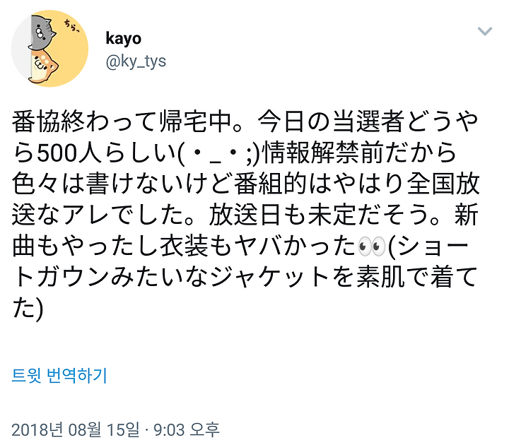 방송협력 끝나고 귀가 중. 오늘의 당선자 아무래도 500명 것 같다.(·_·;)정보 허용 전이니까 이것 저것은 못쓰지만 프로그램적으로는 역시 전국 방송인 그것이었습니다. 방송일도 미정이다고. 신곡도 하고 의상도 장난 아니었다👀(쇼트 가운 같은 재킷을 맨살에 입었다)