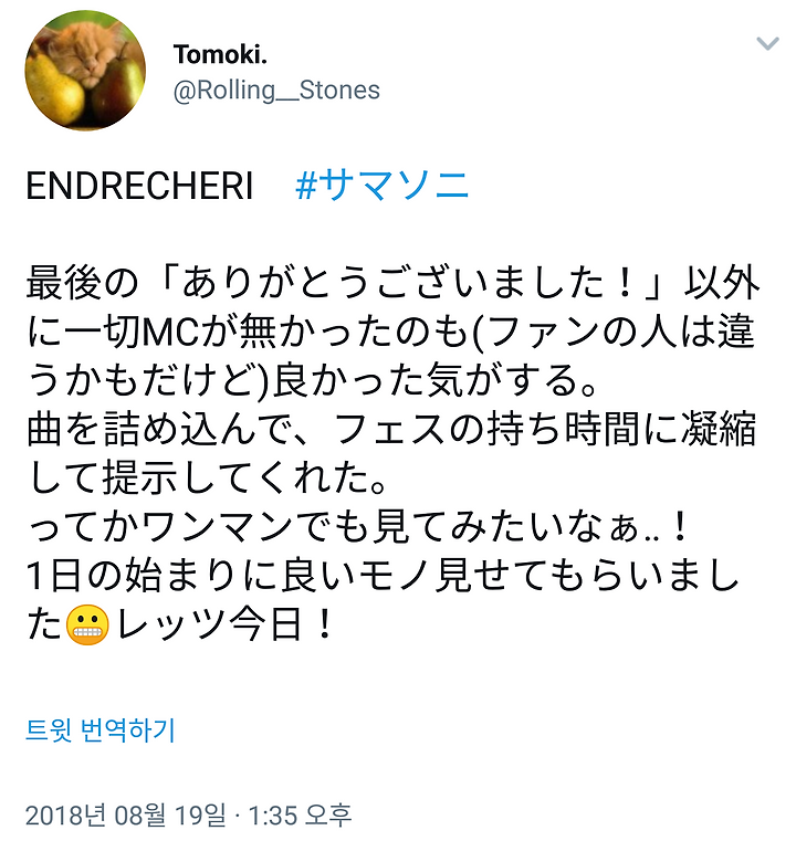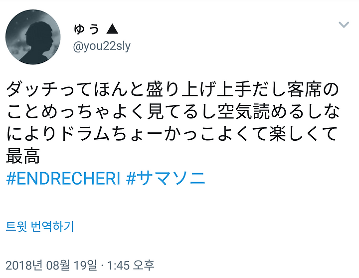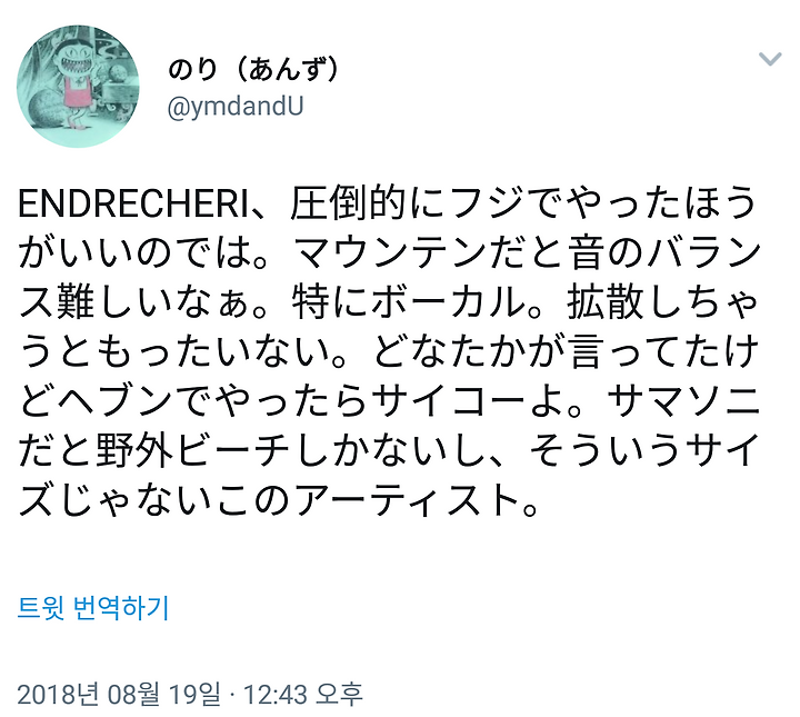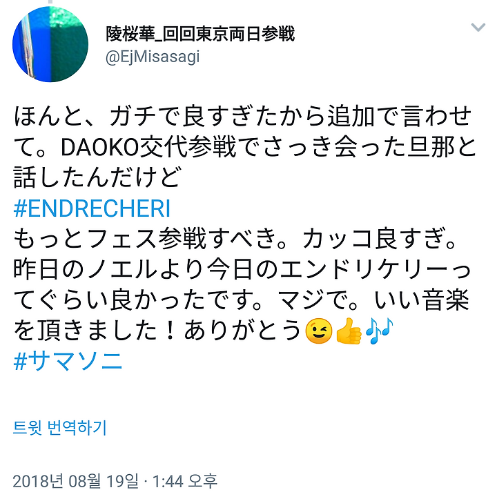 정말 진심으로 너무 좋아서 추가로 말하게 해줘. DAOKO 교체 참전으로 아까 만난 남편과 말했었는데 #ENDRECHERI 좀 더 페스 참전해야만 할 것. 너무 멋있어. 어제의 노엘보다 오늘의 엔드리케리라고 할 정도로 좋았습니다. 진심으로. 좋은 음악을 받았습니다! 고마워 😉👍🎶