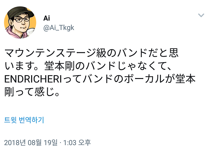 마운틴 스테이지급 밴드라고 생각합니다. 도모토 쯔요시의 밴드가 아니라, ENDRICHERI라는 밴드의 보컬이 도모토 쯔요시라는 느낌.