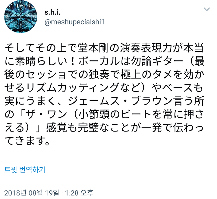 그리고 그 위에 도모토 쯔요시의 연주 표현력이 정말 멋진! 보컬은 물론 기타(마지막 셋션 독주에서 극상의 리듬 커팅 등)이나 베이스도 참 잘하고 제임스 브라운이 말하는 "더 원(소절 머리의 비트를 항상 억제)" 감각도 완벽한 것이 한 방에서 전해집니다.