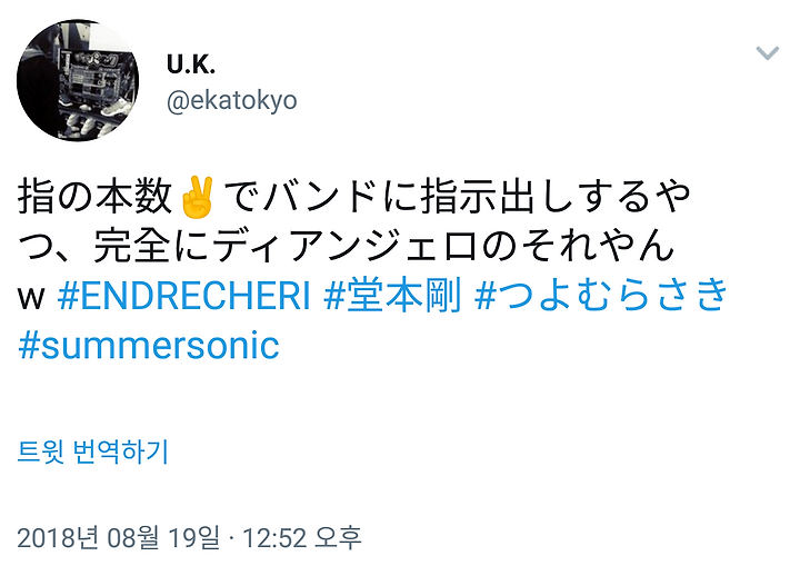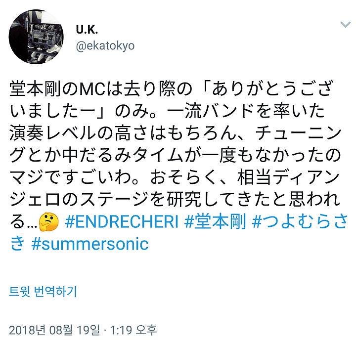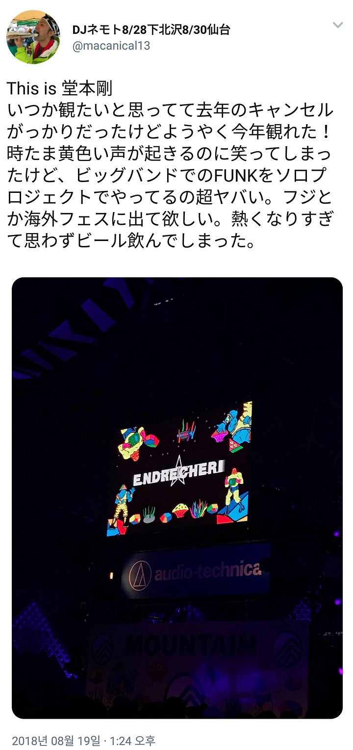 도모토 쯔요시의 MC는 들어갈 때 "고맙습니다-" 뿐. 일류 밴드를 이끈 연주 레벨의 높음은 물론, 튜닝이나 중간 늘어지는 시간이 한 번도 없었던 것 진심 굉장한. 아마 상당히 디앙젤로의 스테이지를 연구했다고 생각된다...🤔 #ENDRECHERI #도모토 츠요시 # 쯔요 무라사키 #summersonic