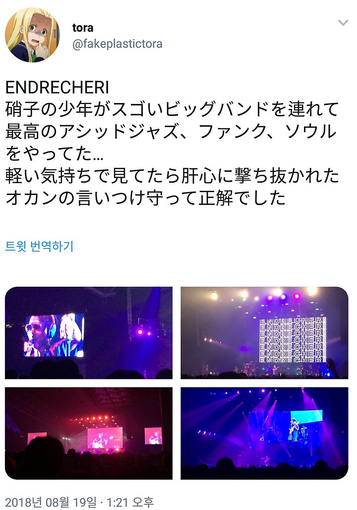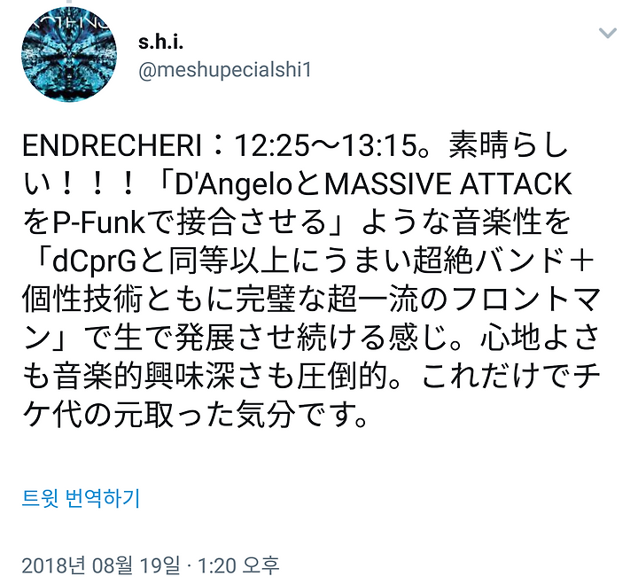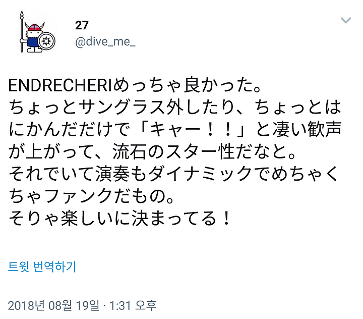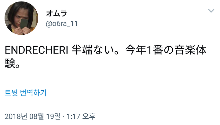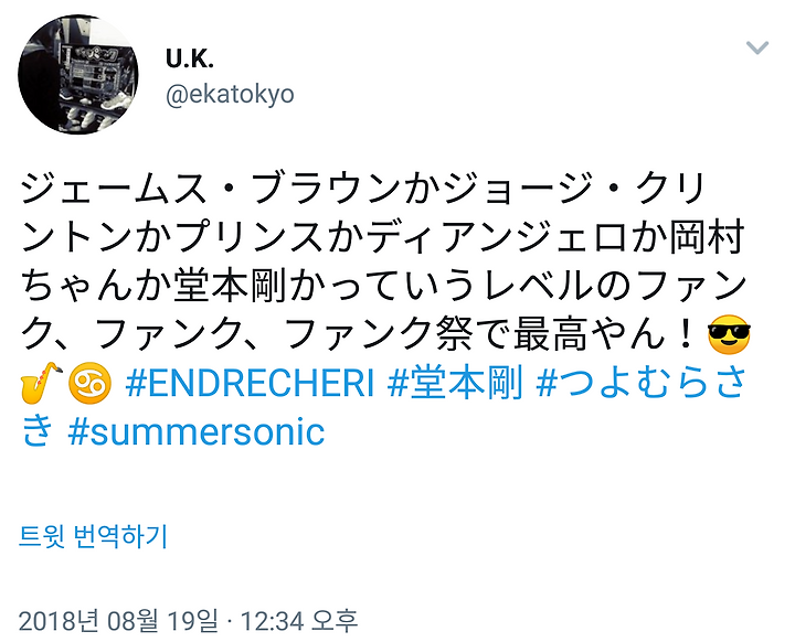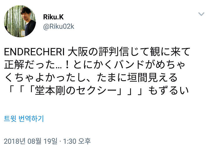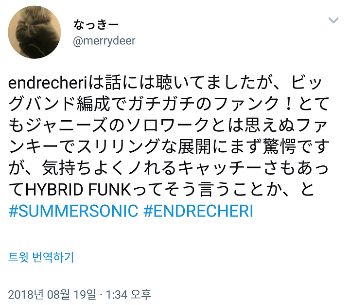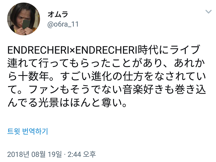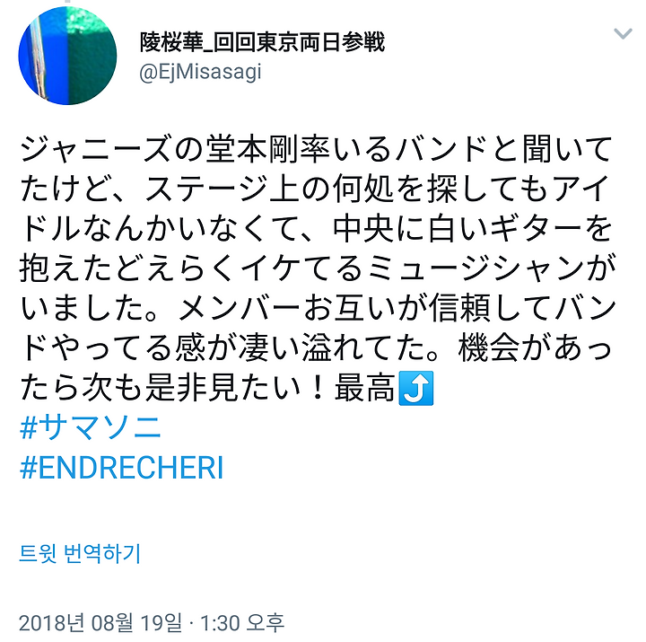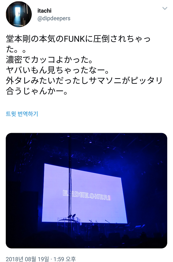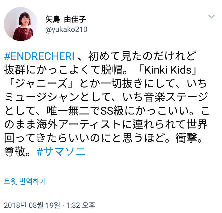 #ENDRECHERI, 처음 봤는데 발군에 멋있어서 항복. "Kinki Kids" "쟈니즈"라든가 일절 제외하고 한 뮤지션으로서, 한 음악 무대로, 유일무이하고 SS급ㅇ,러 멋진. 이대로 해외 아티스트와 함께 세계를 돌고 오면 좋겠다고 생각할 만큼. 충격. 존경.