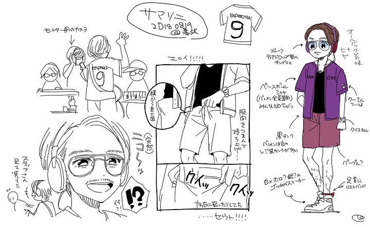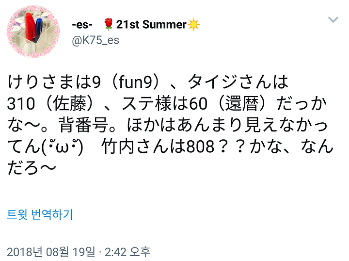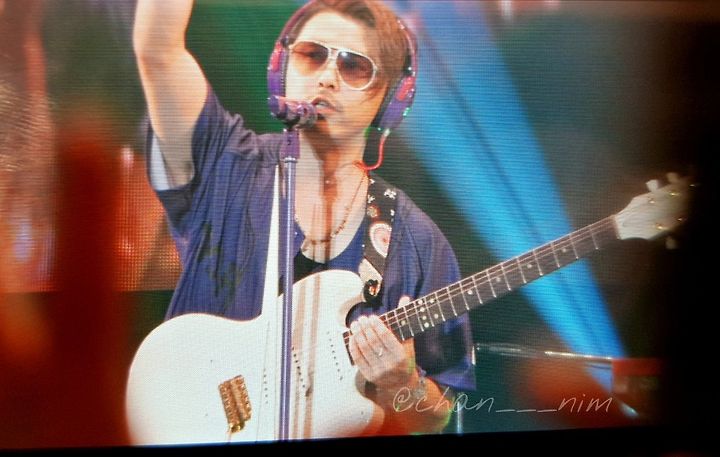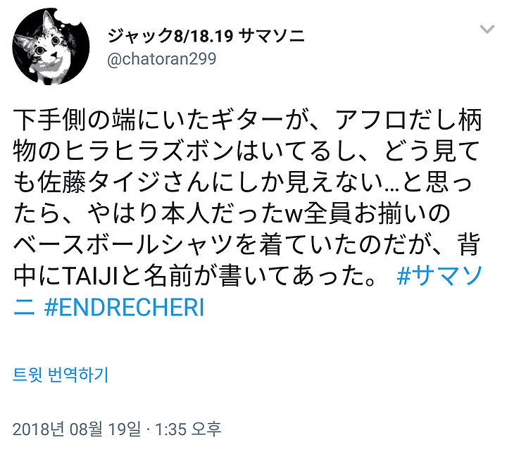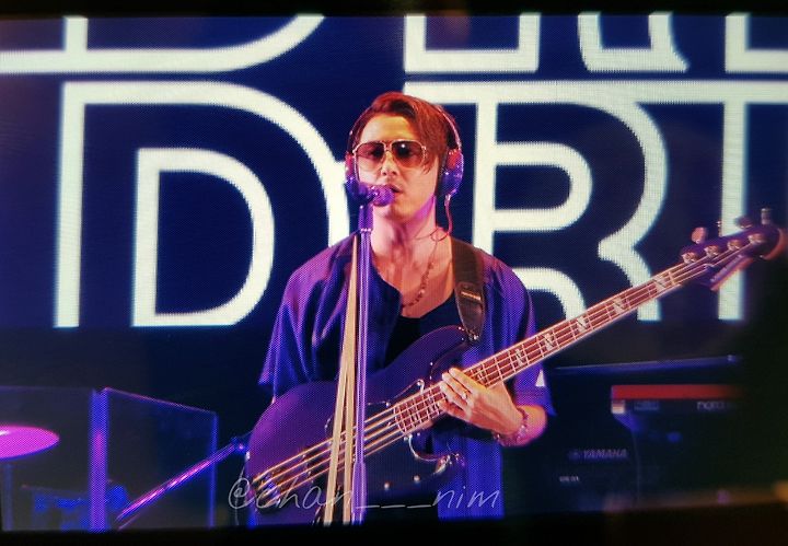 하수 측 끝에 있던 기타가 아프로 머리이고, 무늬 있는 펄럭 펄럭거리는 바지는 입고 있고, 아무래도 사토 타이지씨로 밖에 보이지 않는다…라고 생각했더니 역시 본인이었다w 모두 세트로 베이스볼 셔츠를 입고 있었지만 등에 TAIJI와 이름이 씌어 있었다.