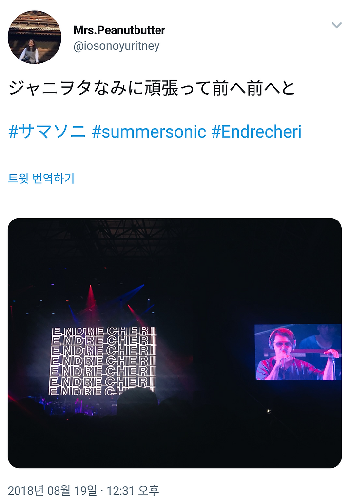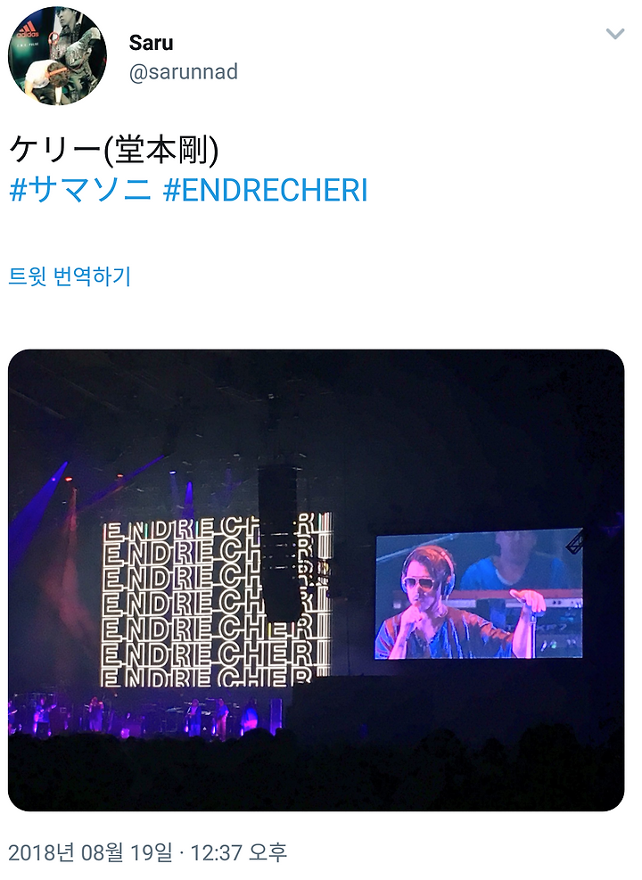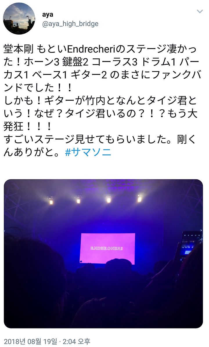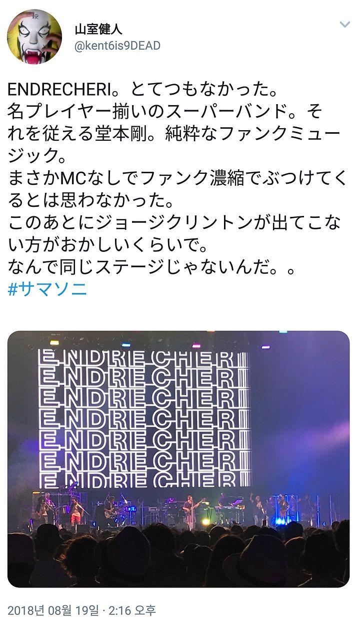 思えば僕のフェスデビューである昨年のサマソニ大阪は、もともとは家内がENDRECHERIを観に行きたいと言ったのがきっかけだった。そのときの剛くんの体調不良による出場断念は残念だったけど、今回は無事観られたし、僕もおかげで新しい世界が開けたので感謝 #ENDRECHERI #サマソニ #SUMMERSONIC2018