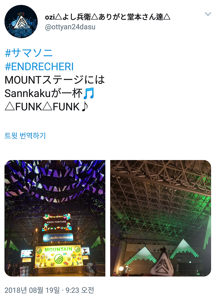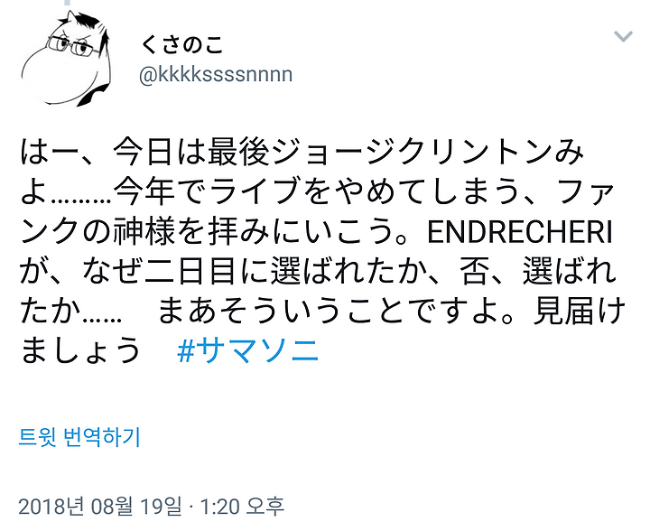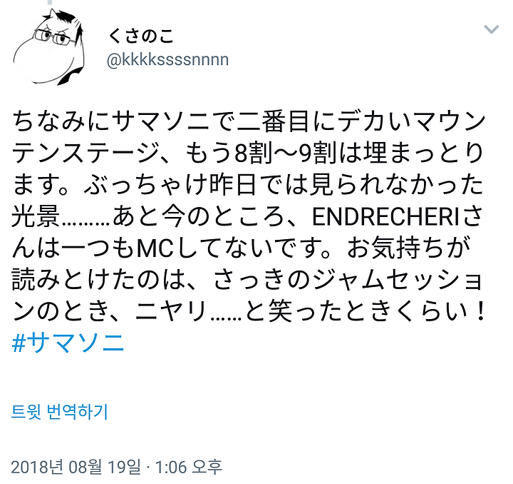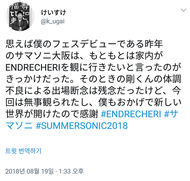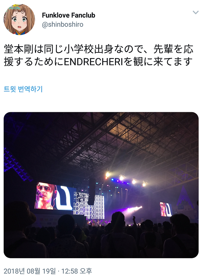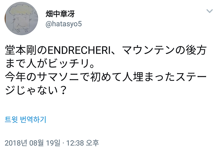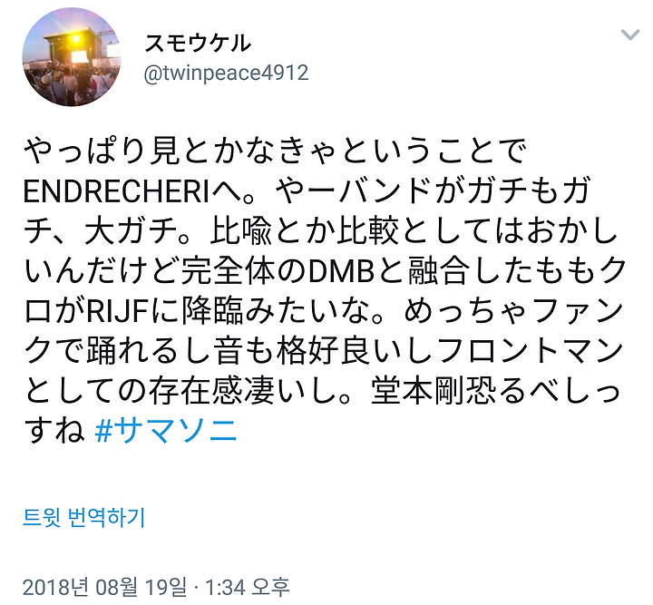 思えば僕のフェスデビューである昨年のサマソニ大阪は、もともとは家内がENDRECHERIを観に行きたいと言ったのがきっかけだった。そのときの剛くんの体調不良による出場断念は残念だったけど、今回は無事観られたし、僕もおかげで新しい世界が開けたので感謝 #ENDRECHERI #サマソニ #SUMMERSONIC2018