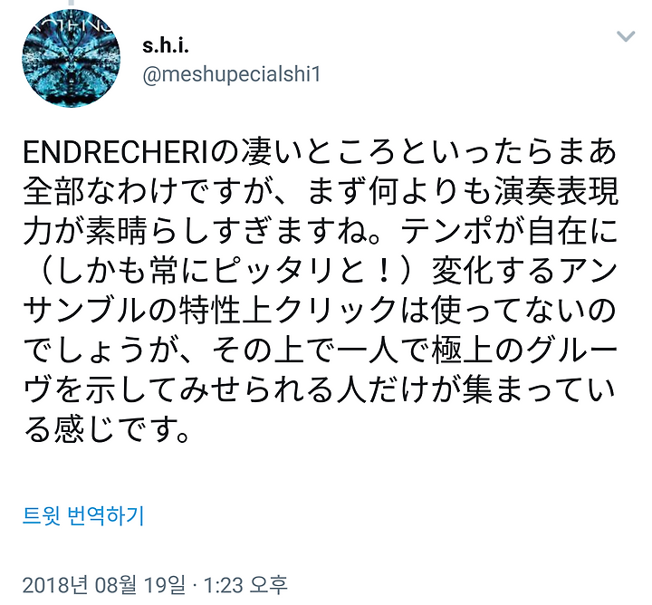 ENDRECHERI의 대단한 곳이라고 하면 뭐 전부이지만, 우선 무엇보다도 연주 표현력이 너무 훌륭하네요. 템포가 자유자재로 (그것도 항상 딱맞고!) 변화하는 앙상블의 특성상 박자 클릭은 사용하지 않겠지만 그런 상태에서 혼자 극상의 그루브를 보여주는 사람들만 모인 느낌이에요.