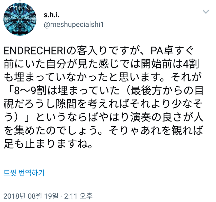 ENDRECHERI의 관객 입장입니다만, PA상 바로 앞에 있던 자신이 본 느낌으로는 시작 전에는 4할도 메워지지 않았다고 생각합니다. 그것이 "8~9할은 가득 차 있었다(최후방의 시선일텐데 틈을 생각하면 그보다 적을 것 같은)" 라고 한다면 연주의 좋은 점이 사람을 모은 거겠죠. 그거야 저걸 보면 발을 멈추겠지요.