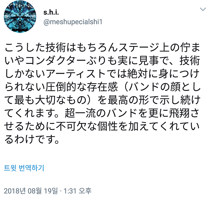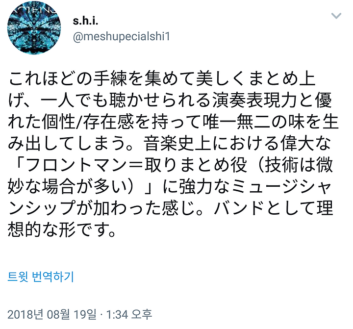이러한 기술은 물론 스테이지 위의 풍취나 지휘자 역할도 실로 훌륭해서 기술밖에 없는 아티스트라면 절대로 익힐 수 없는 압도적인 존재감 (밴드의 얼굴로서 가장 소중한 것)를 최고의 형태로 제기합니다. 초일류의 밴드를 더욱 비상하기 위해서 불가결한 개성을 가해 주는 셈이지요.