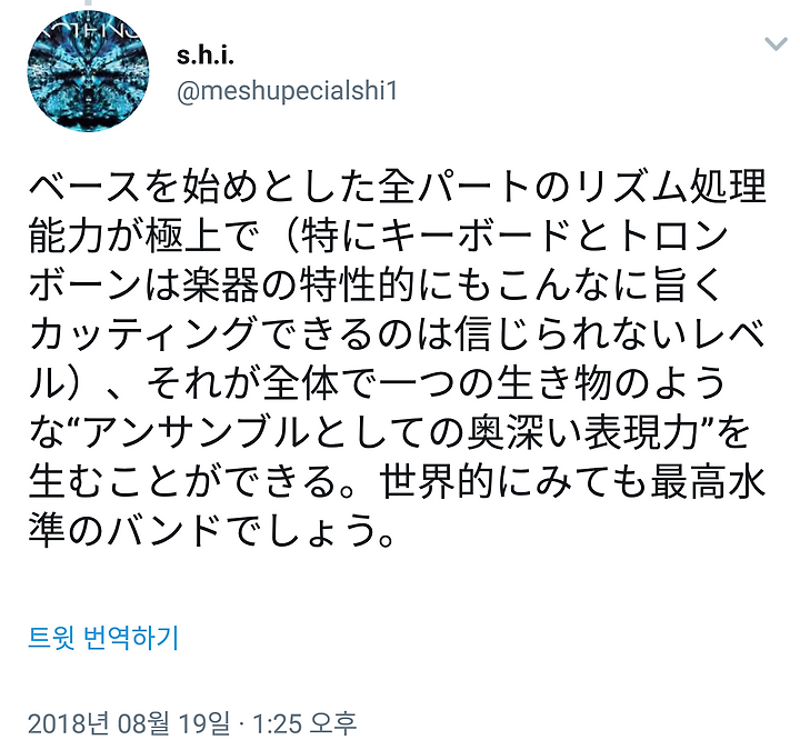 베이스를 비롯한 전 파트의 리듬 처리 능력이 베스트여서 (특히 키보드와 트롬본은 악기의 특성적으로도 이렇게 잘 커팅 할 수 있는 것은 믿을 수 없는 수준), 그것이 전체로 하나의 생물 같은 "앙상블의 심오한 표현력" 을 만들어낼 수 있다. 세계적으로 최고 수준의 밴드겠죠.