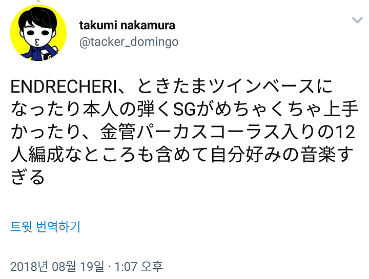 ENDRECHERI, 가끔 트윈 베이스가 되거나 본인의 치는 SG가 무척 잘하거나, 금관 퍼커션션, 코러스가 들어간 12인조인 점도 포함하고 너무 내 취향의 음악