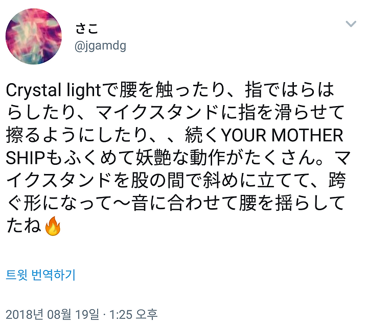 Crystal light로 허리를 만지거나, 손가락으로 아슬아슬하거나, 마이크 스탠드를 손가락을 타고 문지르거나, 계속되는 YOUR MOTHER SHIP도 포함해서 요염한 동작이 잔뜩. 마이크 스탠드를 가랑이 사이로 비스듬히 세우고 걸쳐서, 소리에 맞추며 허리를 흔들었네 🔥
