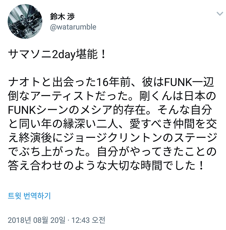 ナオトと出会った16年前、彼はFUNK一辺倒なアーティストだった。剛くんは日本のFUNKシーンのメシア的存在。そんな自分と同い年の縁深い二人、愛すべき仲間を交え終演後にジョージクリントンのステージでぶち上がった。自分がやってきたことの答え合わせのような大切な時間でした!
