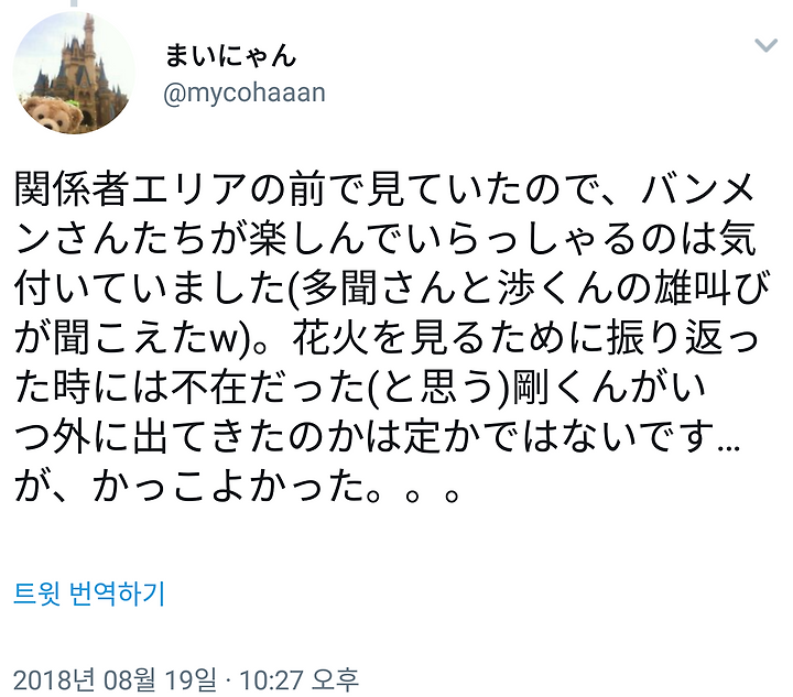 関係者エリアの前で見ていたので、バンメンさんたちが楽しんでいらっしゃるのは気付いていました(多聞さんと渉くんの雄叫びが聞こえたw)。花火を見るために振り返った時には不在だった(と思う)剛くんがいつ外に出てきたのかは定かではないです…が、かっこよかった。。。관계자 구역 앞에서 보고 있었기 때문에 밴드 멤버상들이 즐기고 계신 것은 알고 있었습니다(타몬씨와 와타루의 포효가 들렸다 w). 불꽃을 보려고 돌아봤을 때에는 부재였었 (다고 생각한다) 쯔요시군이 언제 밖으로 나왔는지는 분명치 않습니다… 멋, 멋있었어.